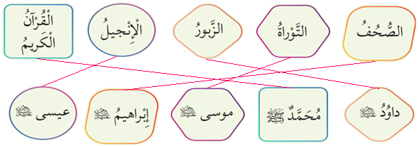 (1) أصل بخط بين كل شكلين متماثلين؛ لأربط بين اسم الرسول عليه السلام والكتاب الذي أنزل عليه: