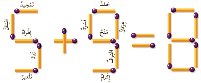 (1) أحذف عود الثقاب الذي يحمل كلمة مختلفة؛ لتصبح النتيجة صحيحة فيما يأتي: