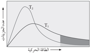 يمثل المنحنى توزيع الطاقة الحركية على الجزيئات عند درجتي حرارة T1 و T2، العبارة الصحيحة مما يأتي هي: