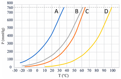 إذا كان الضغط الجوي 0.79 ضغط جوي، فإن السائل D يغلي على درجة حرارة (oC):