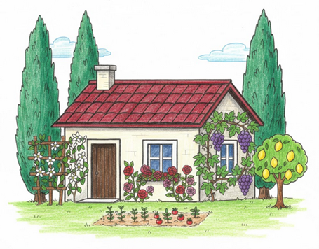 أرسم حول المنزل الآتي نباتات: أشجار سرو، وأشتال زعتر، وأشجار ورد جوري، وشجرة ياسمين، وأشتال بندورة، وشجرة عنب، وشجرة ليمون، ثم ألونها، مع مراعاة وضع كل نوع في المكان المخصص.