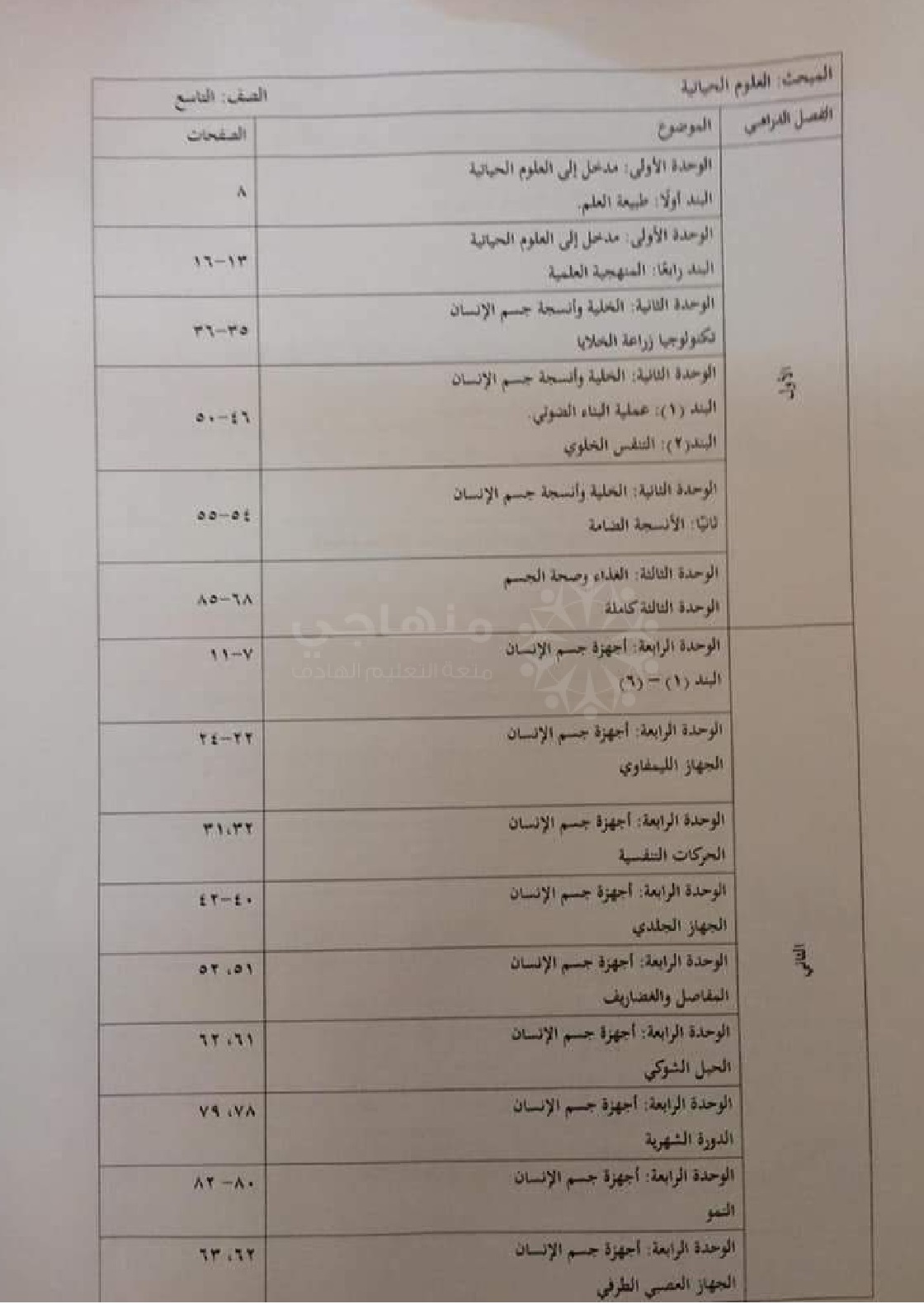 مواضيع المطالعة الذاتية في محبث العلوم الحياتية الصف التاسع للفصلين الأول والثاني