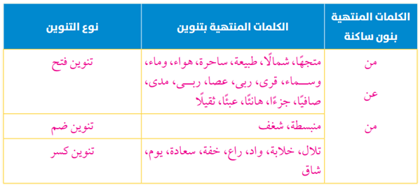أقرأُ النَّصَّ الآتي ثُمَّ أستخرج منه الكلمات التي تنتهي بنون ساكنة والكلمات المُنوّنة، مُبيِّنًا نوع التنوين مستعينًا بالجدول اللاحق: