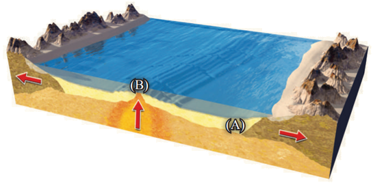 أقارن: إذا حصلت على عينتين من صخور أحد قيعان المحيطات في الموقعين (A) و (B) كما في الشكل الآتي، فأيهما الأحدث عمرًا؟ لماذا؟