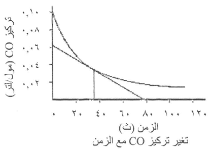 يمثل الشكل التالي العلاقة بين تغير تركيز CO مع الزمن للتفاعل